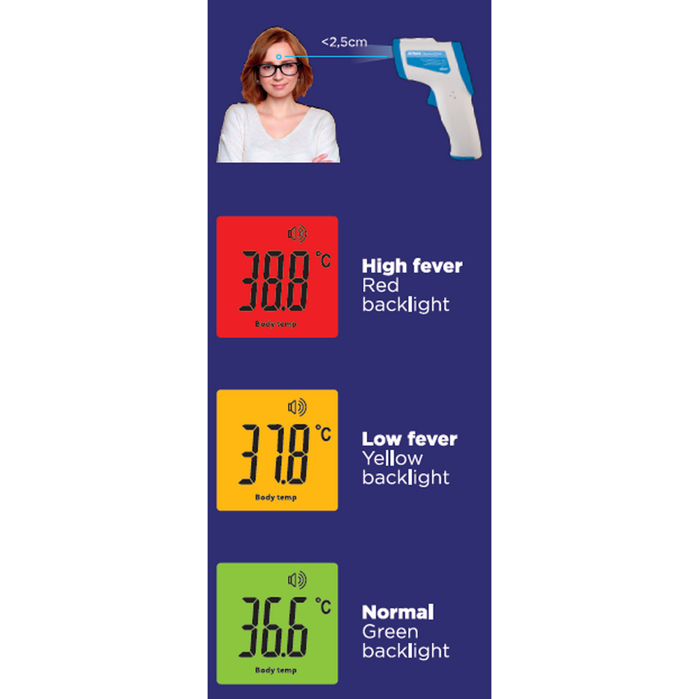 ΧΑΡΑΚΤΗΡΙΣΤΙΚΑ Εύκολη και ανέπαφη μέτρηση από το μέτωπο σε 1 δευτερόλεπτο Με την ακρίβεια και αξιοπιστία της AVRON Ασφαλές. Δεν μεταφέρει μικρόβια Με οπτικό και ηχητικό συναγερμό πυρετου Μεγάλη φωτιζόμενη οθόνη LCD με 3 χρώματα (πράσινο χρώμα για κανονική θερμοκρασία, πορτοκαλί για πυρετό και κόκκινο για υψηλό πυρετό) Δυνατότητα μέτρησης της θερμοκρασίας επιφανείας αντικειμένων (πχ γάλα) και της θερμοκρασίας δωματίου...