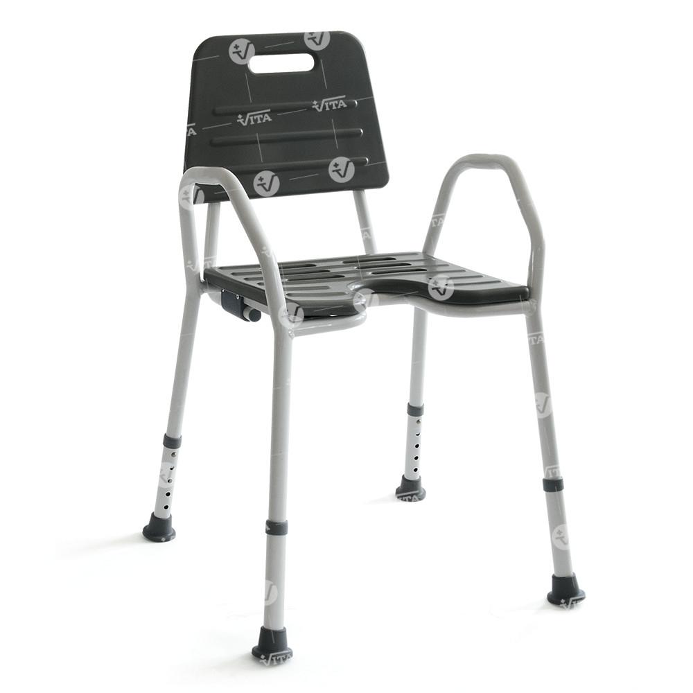 Καρέκλα ελαφρού τύπου. Η πλάτη και το κάθισµα είναι από µαλακό, αδιάβροχο ελαστικό υλικό, µε αντιολισθητική επιφάνεια. Το ύψος είναι ρυθµιζόµενο για εύκολη πρόσβαση από και προς την µπανιέρα. Το εύρος της πλάτης ρυθµίζεται σε τρεις θέσεις επιλογής. Αντιολισθητικές τάπες.