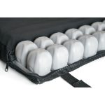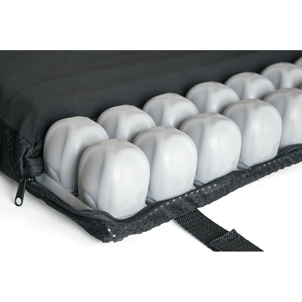 Το µαξιλάρι "air cell" αποτελείται από δύο τµήµατα, (αεροθαλάµους), που ενεργοποιούνται αυτόνοµα, αναλόγως της πίεσης του σωµατικού βάρους. Ο ανατοµικός σχεδιασµός βελτιώνει την όποια αστάθεια της λεκάνης και του κορµού. Η άνω επιφάνεια του καλύµµατος, λόγω της υφής της, επιτρέπει στις αεροκυψέλες να ενεργούν ανεξάρτητα και να προσαρµόζονται στο σχήµα του σώµατος. Η βάση του καλύµµατος είναι αντιολισθητική και σταθερή....