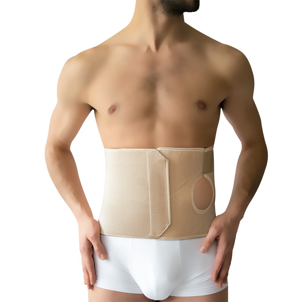 Ελαστική ζώνη από βαμβακερό υποαλλεργικό ύφασμα, δυο τεμαχίων. Αυτοκόλλητη σε δυο σημεία. Φέρει οπή κολοστομίας από 7 έως 8cm. Συνολικό ύψος 20cm. Πλένεται.